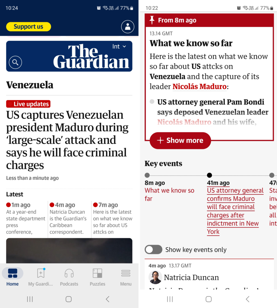Por un lado, una publicación de The Guardian acerca del operativo de EE.UU. en Venezuela de comienzos de año.